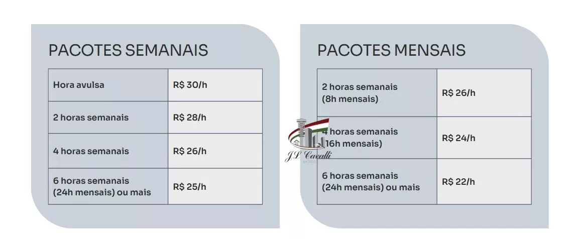 Quanto mais horas por semana, menor o valor por hora. Faça seu orçamento!